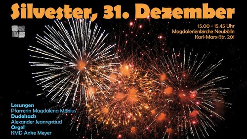 Musik, Texte und Segen begleiten unser Innehalten und Abschied von diesem Jahr und entlassen uns kraftvoll in den Altjahresabend! Anschließend laden wir unter der Orgelempore zum Umtrunk ein.